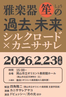 サーサーン朝(226 ~651年)の図像資料にも見られ、仏教伝来とともに日本に伝来した様子、現在はどの国のどのようなシーンで演奏されているのか、など、当館学芸員によるミニ講座もあわせて開催。
