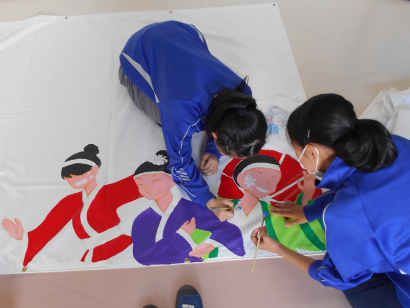 2019年度は、世界共通のテーマについて対話的・協働的に学び合い、共同で1枚の壁画を制作する「アートマイル国際協働プロジェクト」にパートナー校として参加。SDGsの目標から「11:住み続けられるまちづくりを」をテーマにし、岡山市とソフィア市の象徴的な文化や風景を描いた壁画を制作しています。完成した壁画は、2020年東京オリンピック・パラリンピックの会場に展示される予定です。