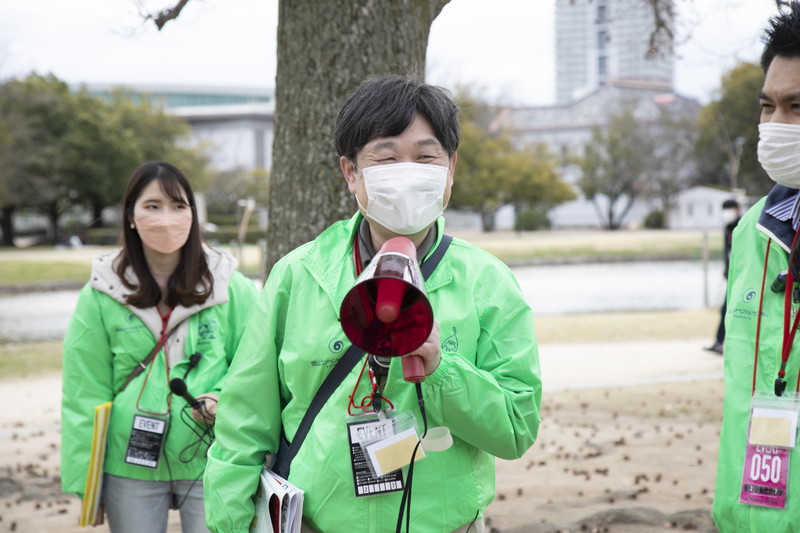 このツアーでは、シティライトスタジアムがある岡山県総合グラウンド内の関連スポット7ヵ所をボランティアガイドと歩いて巡りました。