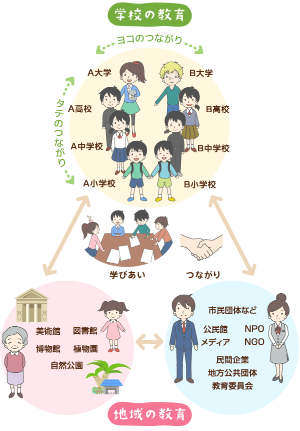 学校の教育では小学校、中学校、高校、大学へのタテのつながりと、各学校の違いによるヨコのつながりがあります。