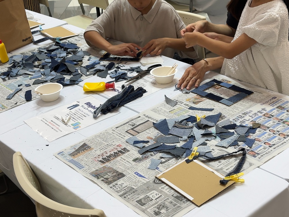 ジーンズの裾上げで出た切れ端をフレームに貼り付けて作るオリジナルフォトフレームづくりでは、子どもたちが「家族旅行の写真を飾りたい」などと思い思いの用途を語り、布や色合いの違いを楽しみながら、世界に一つだけのフォトフレームをつくりました。