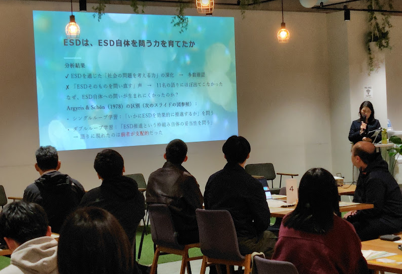また、ESDを通して社会問題を考える力の深化が見られた一方、ESDそのものの在り方を問う力を育てたのだろうかという疑問も見つかりました。最後に今後は、ESDを問い直す声が生まれるにはどのような条件が必要かを考えていくことで、ESDの活動が更に良いものになるのではないかという提案がされました。