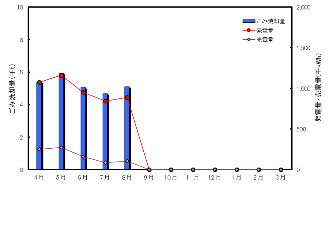 ごみ焼却量(単位:t) | 発電量(単位:kWh) | 売電量(単位:kWh) | |
