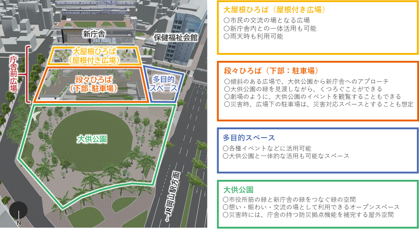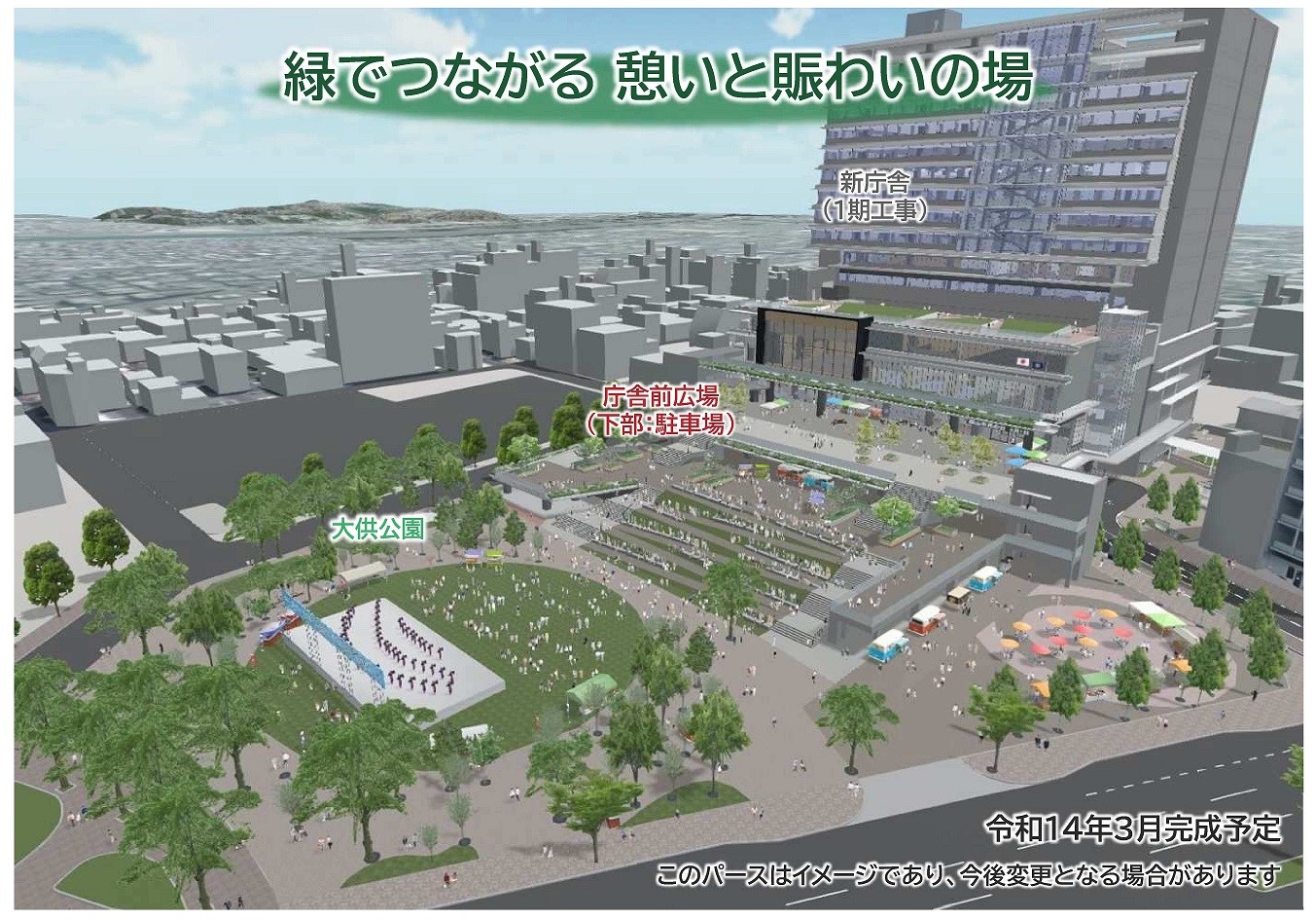 供用開始後は現本庁舎の跡地に新庁舎の周辺施設として大供公園、庁舎前広場及び駐車場を整備する予定です。(新庁舎周辺施設整備事業)