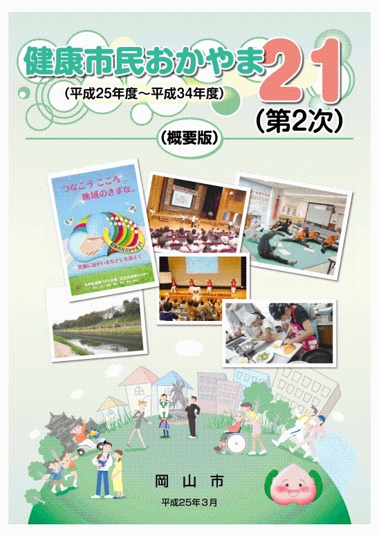 岡山市では、「すべての市民が健康で自分らしく生きられるまち」を目指し、平成15年1月に「健康市民おかやま21」を策定し、市民と行政が一体となり健康づくり運動を推進してきました。平成24年度に計画の終期を迎えるにあたり、10年間の取組の分析・評価を行うとともに、健康市民おかやま21推進会議をはじめ、多くの市民・関係団体等の協力を得て、新たに次の10年を展望した「健康市民おかやま21(第2次)」を策定しました。