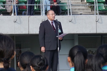 教育長が岡山市学童陸上運動記録会の開会式において、「参加する児童の皆さんは素晴らしい競技場で最高のパフォーマンスを発揮できるように力いっぱい頑張ってください。また会場にいるすべての人が『ONE TEAM』となって盛り上がることを期待します。」と激励の言葉を述べました。