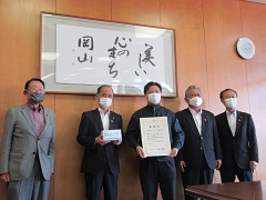新型コロナウイルス感染症対策の取り組みとして、明日檜会から医療用マスクが寄贈され、大森雅夫岡山市長が受け取りました。