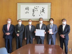 協同組合岡山県卸センターから新型コロナウイルス感染症対策に取り組んでいる岡山市立市民病院に寄付金の贈呈があり、大森雅夫岡山市長が贈呈式に出席しました。