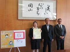 「さんかくウイーク2020」ポスターイラスト最優秀賞表彰式が行われ、大森雅夫岡山市長が最優秀受賞者を表彰しました。