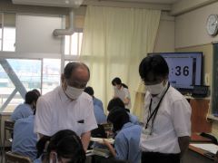 大森雅夫岡山市長が岡山市立高島中学校を訪問し、総合的な学習の時間でパソコンを使った授業を参観しました。
