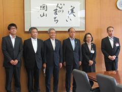 特定非営利活動法人岡山市日中友好協会土井章弘会長から、第16回自治体国際交流表彰(総務大臣表彰)受賞について、大森雅夫岡山市長が報告を受けました。