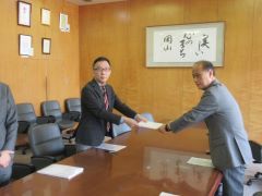 株式会社新日本エネックスから「心豊かな岡山っ子応援団」へ寄付金の贈呈があり、大森雅夫岡山市長が受け取りました。