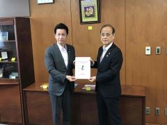 経済産業省の長峯誠大臣政務官に対して大森雅夫岡山市長が政令指定都市を代表して「地域経済の成長発展に資する土地利用に関する指定都市市長会提言」を行いました。
