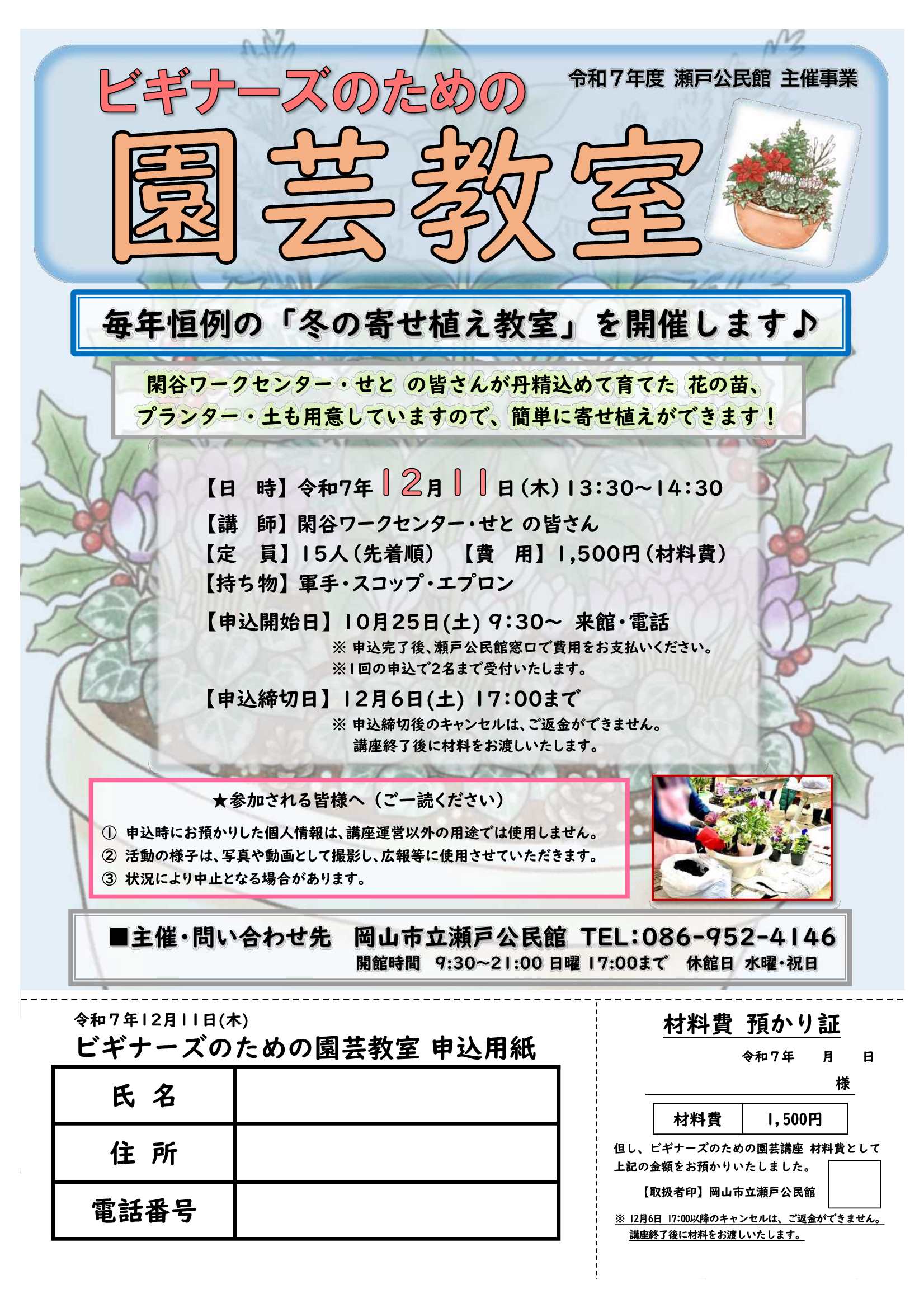 閑谷ワークセンター・せと の皆さんが丹精込めて育てた 花の苗、プランター・土も用意していますので、簡単に寄せ植えができます!初心者のための、やさしい園芸教室です。
