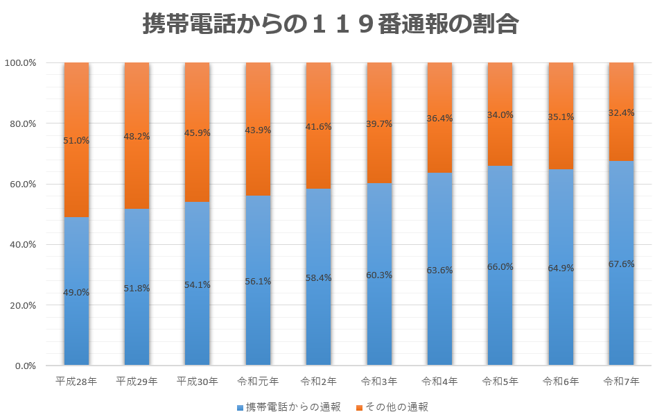 令和7年の携帯電話からの119番通報の割合は約67.6%でした。携帯電話からの119番通報の注意点は下記のページへ。