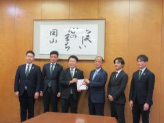 明治安田生命保険相互会社岡山支社から、心豊かな岡山っ子応援団へ寄附金の贈呈があり、大森雅夫岡山市長が受け取りました。