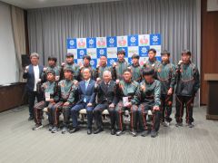 2025ヤングリーグ グランドチャンピオン大会で優勝したオール岡山ヤングの選手・関係者が、大森雅夫岡山市長を表敬訪問しました。