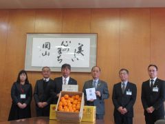 株式会社岡山丸果から、社会福祉施設入所者の方々へ配布する「福祉みかん」100箱が寄贈され、大森雅夫岡山市長が受け取りました。