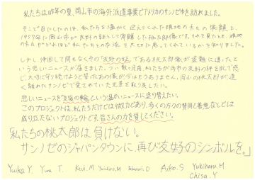 支援者全員に、岡山市長及びサンノゼ市長からの感謝状をお送りいたします。
