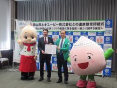 キユーピー株式会社との市民の健康づくりの推進に関する連携協定締結式が開催され、大森雅夫岡山市長が出席しました。