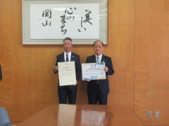 有限会社吉美、有限会社吉備環境設備からのアリーナ整備事業に係る寄附金の贈呈に対し、大森雅夫岡山市長が感謝状を贈呈しました。
